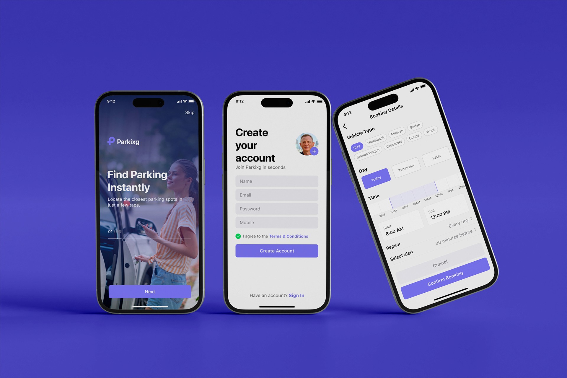 Booking is customizable (vehicle type, time, repeat options, alerts).