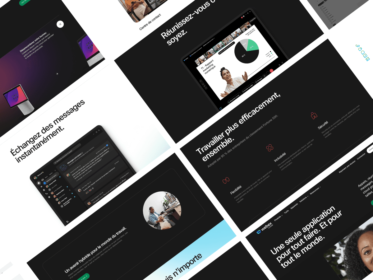 Webex spans many products and use cases, from 1:1 calls to enterprise-grade webinars. The challenge was to make the offering understandable at a glance, without overwhelming users, and to keep the experience fully localized for French audiences. We partnered closely with the Webex brand, product, and regional marketing teams to align messaging, terminology, and compliance while preserving the global identity.